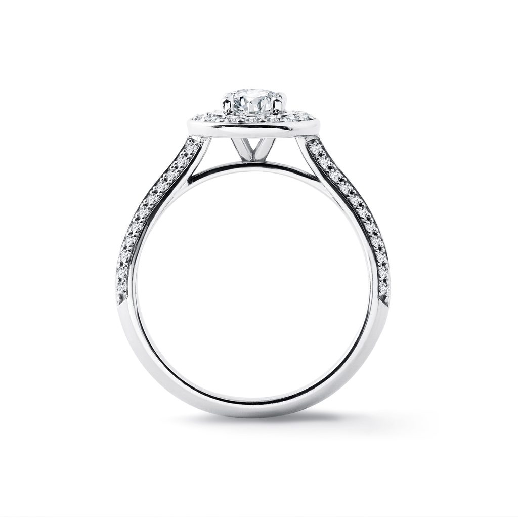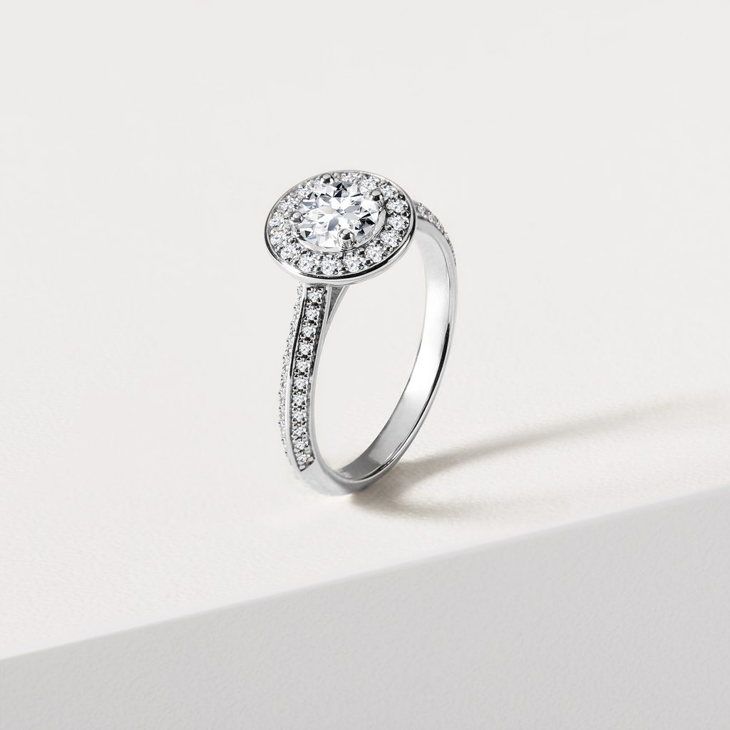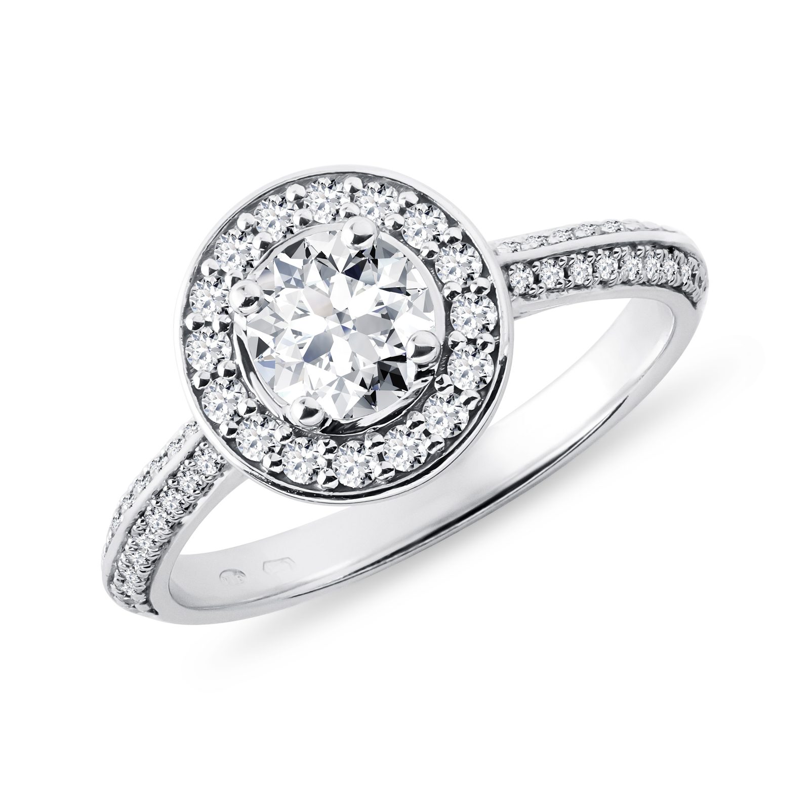 Prsteň v halo štýle z bieleho 14k zlata zdobí diamant okrúhleho výbrusu o váhe 1,0 ct. Centrálny kameň je obklopený čírymi prírodnými diamantmi, ktoré sú v špeciálnom fasovaní pavé (microsetting) osadené aj po obvode obrúčky a dodávajú prsteňu mimoriadny lesk. Vďaka svojmu oslnivému dizajnu je tento prsteň skutočne neprehliadnuteľný a skvele sa hodí ako luxusný darček aj zásnubné prekvapenie.