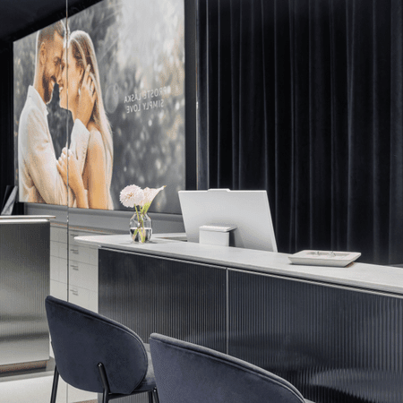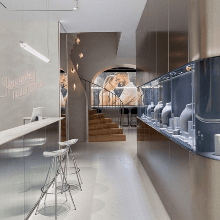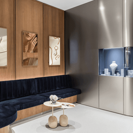V prednej časti showroomu nájdete Gem & Pearl bar. Tu si môžete prezrieť šperky skladom, vyzdvihnúť objednávku alebo využiť naše servisné služby. Zadná časť showroomu patrí zásnubným a snubným prsteňom — pri Promise & Eternity bare prebiehajú osobné konzultácie na výber prsteňov, vrátane merania a skúšky veľkosti.