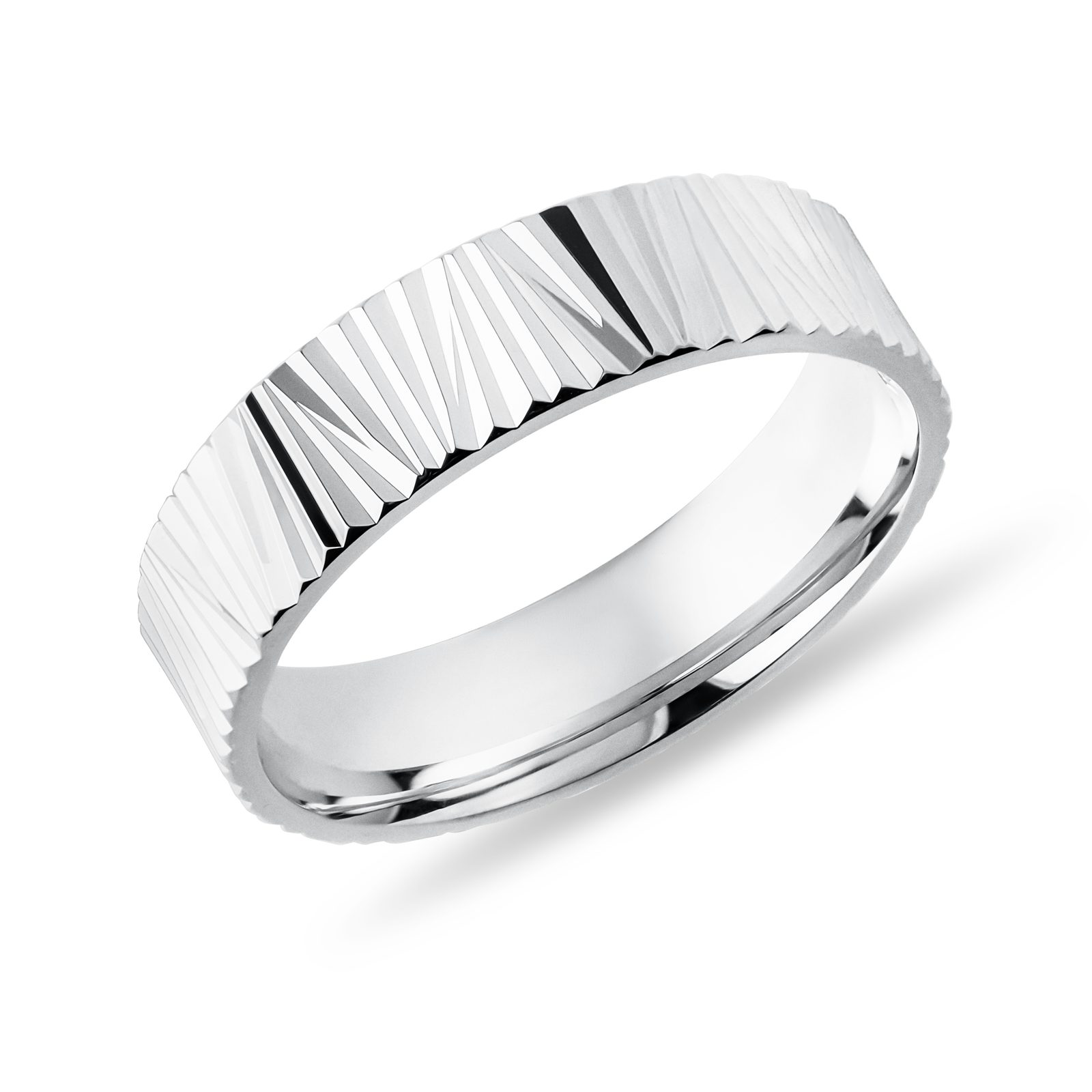 Dámsky prsteň z bieleho zlata o šírke 5 mm zaujme výrazne štruktúrovaným povrchom, ktorý tvorí jemné lúčovité fazety. Precízne ryté plôšky krásne odrážajú svetlo a pri pohybe vytvárajú decentný ligot, takže prsteň pôsobí moderne, ale stále čisto a nadčasovo. Skvele vynikne samostatne aj v kombinácii s hladkými či diamantovými prsteňmi.