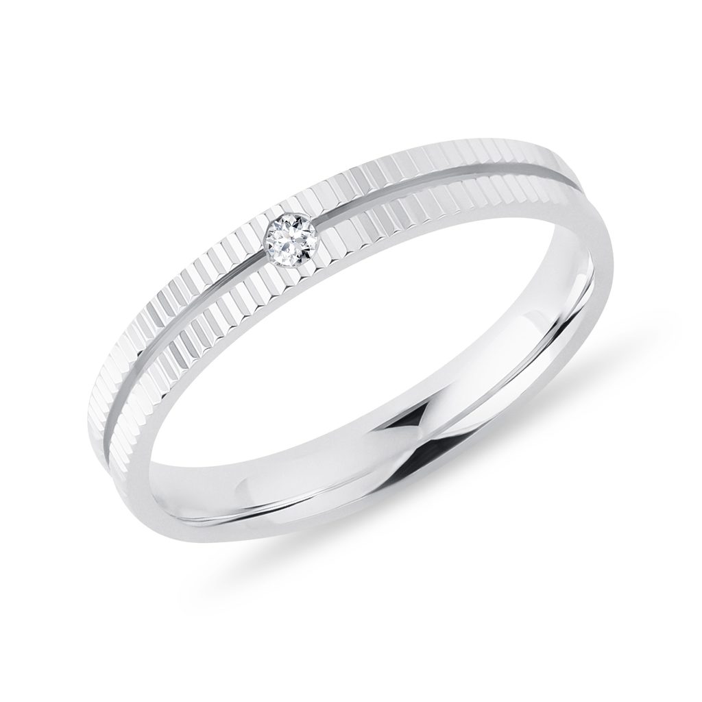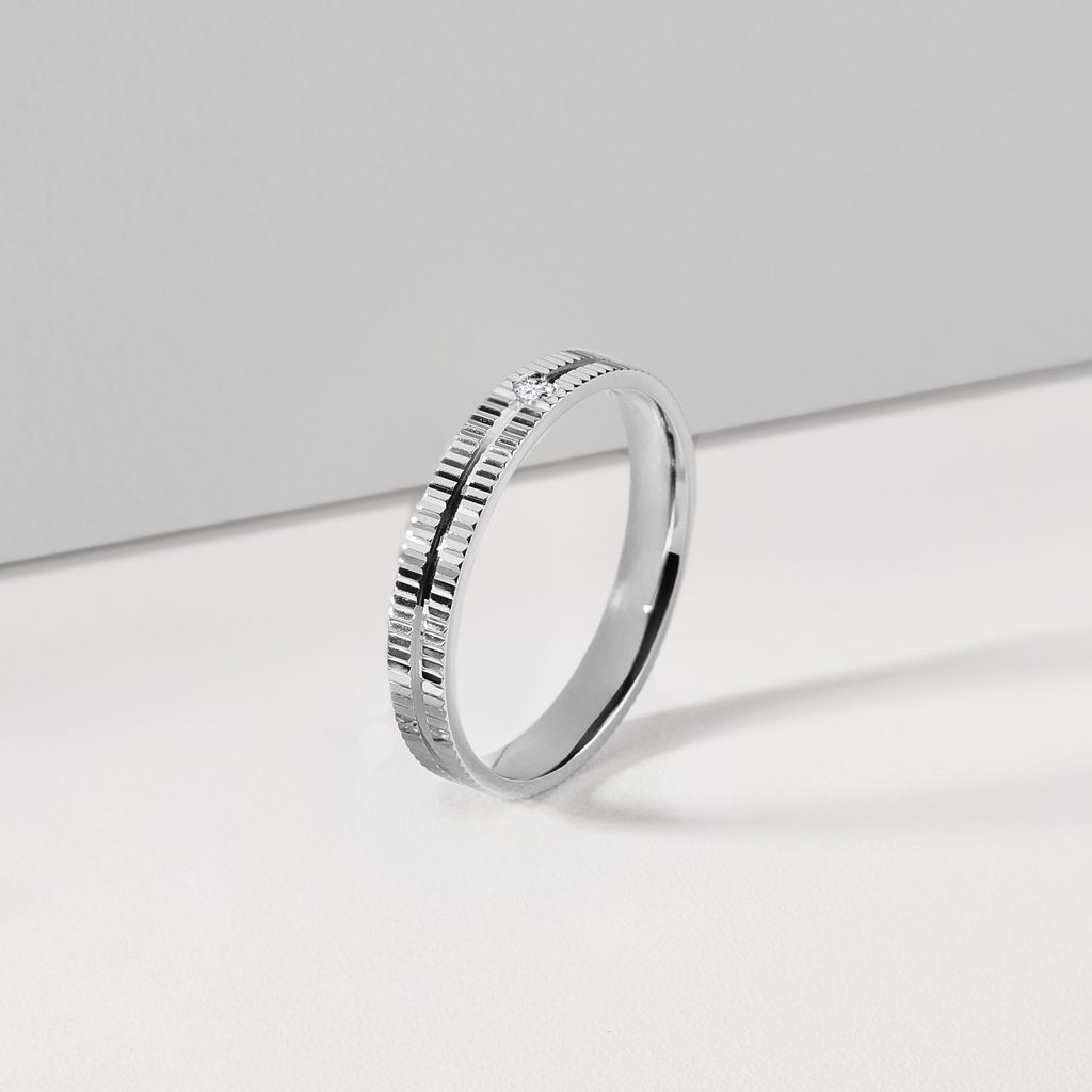 Prsteň z bieleho zlata s diamantom a vrúbkovaním