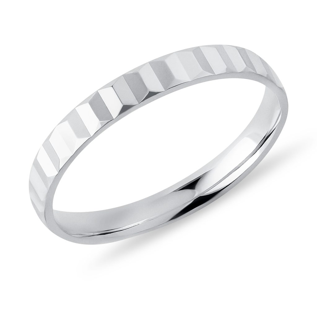 Pánska svadobná obrúčka z bieleho 14-karátového zlata má moderný a čistý dizajn s jemným plisovaným detailom, vytvoreným metódou precízneho strojového gravírovania. Vďaka šírke 3 mm je pohodlná na každodenné nosenie a osloví mužov, ktorí dávajú prednosť klasike s decentným ozvláštnením.