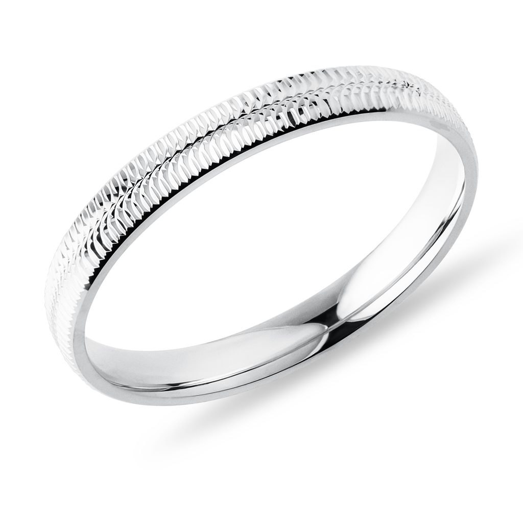 Pánsky prsteň z bieleho 14-karátového zlata so šírkou 3 mm zaujme čistým profilom a precíznym líniovým gravírovaním po obvode. Jemne štruktúrovaný povrch vytvára decentnú hru svetla a dodáva inak minimalistickému prsteňu moderný charakter. Vhodný je aj ako svadobná obrúčka pre mužov, ktorí preferujú jednoduchý, elegantný štýl.