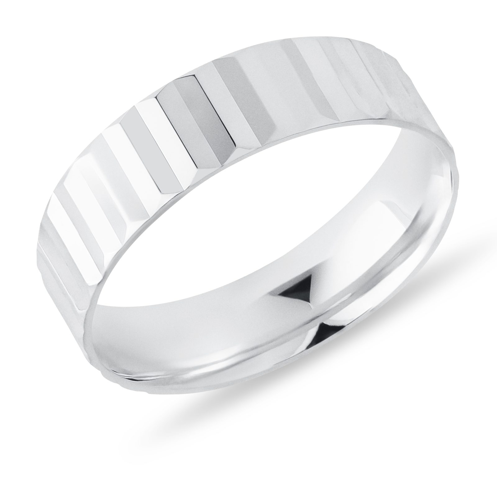 Štýlový pánsky prsteň z bieleho 14-karátového zlata so šírkou 6 mm s jemným plisé detailom, ktorý v kombinácii s lesklým povrchom pôsobí elegantne a nadčasovo. Prsteň vynikne samostatne, ale dá sa ľahko kombinovať aj s ďalšími šperkami. Vďaka svojmu univerzálnemu prevedeniu je vhodný aj ako svadobná obrúčka pre mužov, ktorí hľadajú výraznejší, ale stále nadčasový štýl.