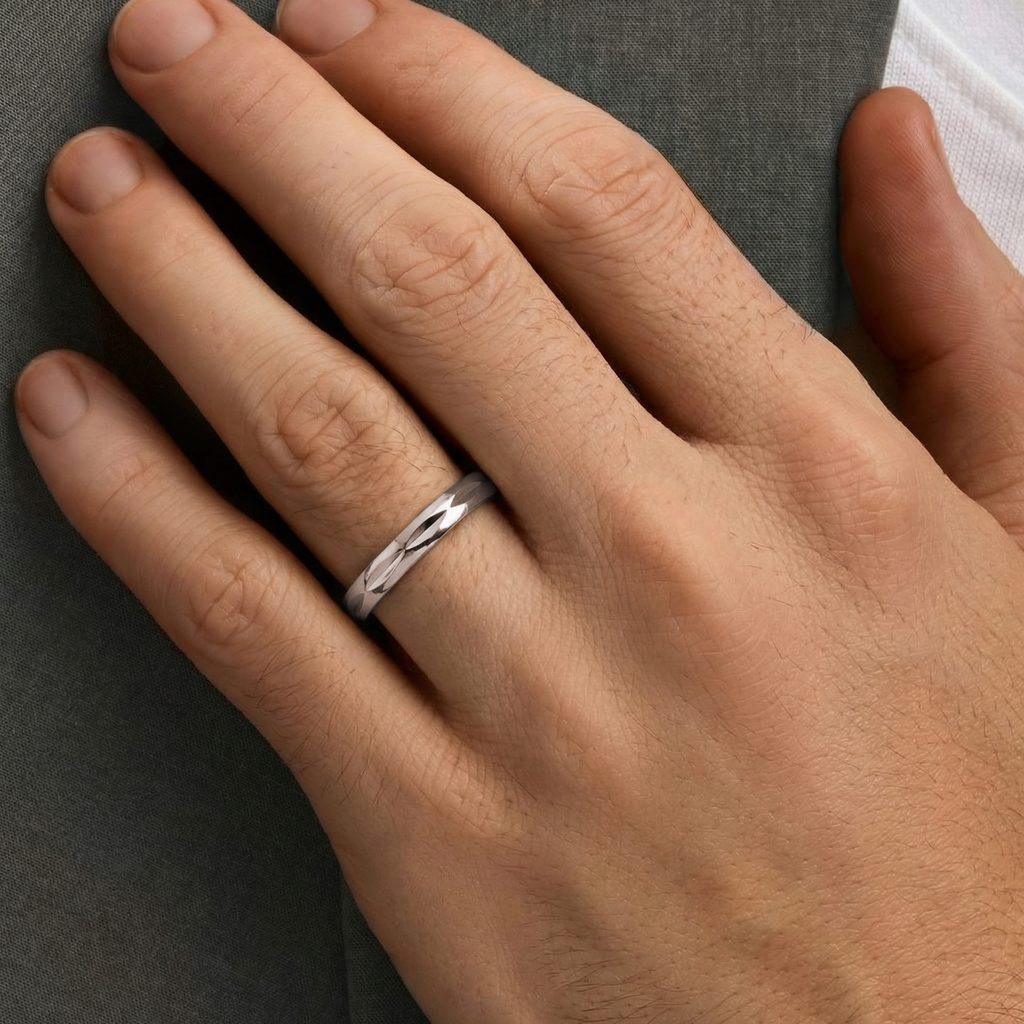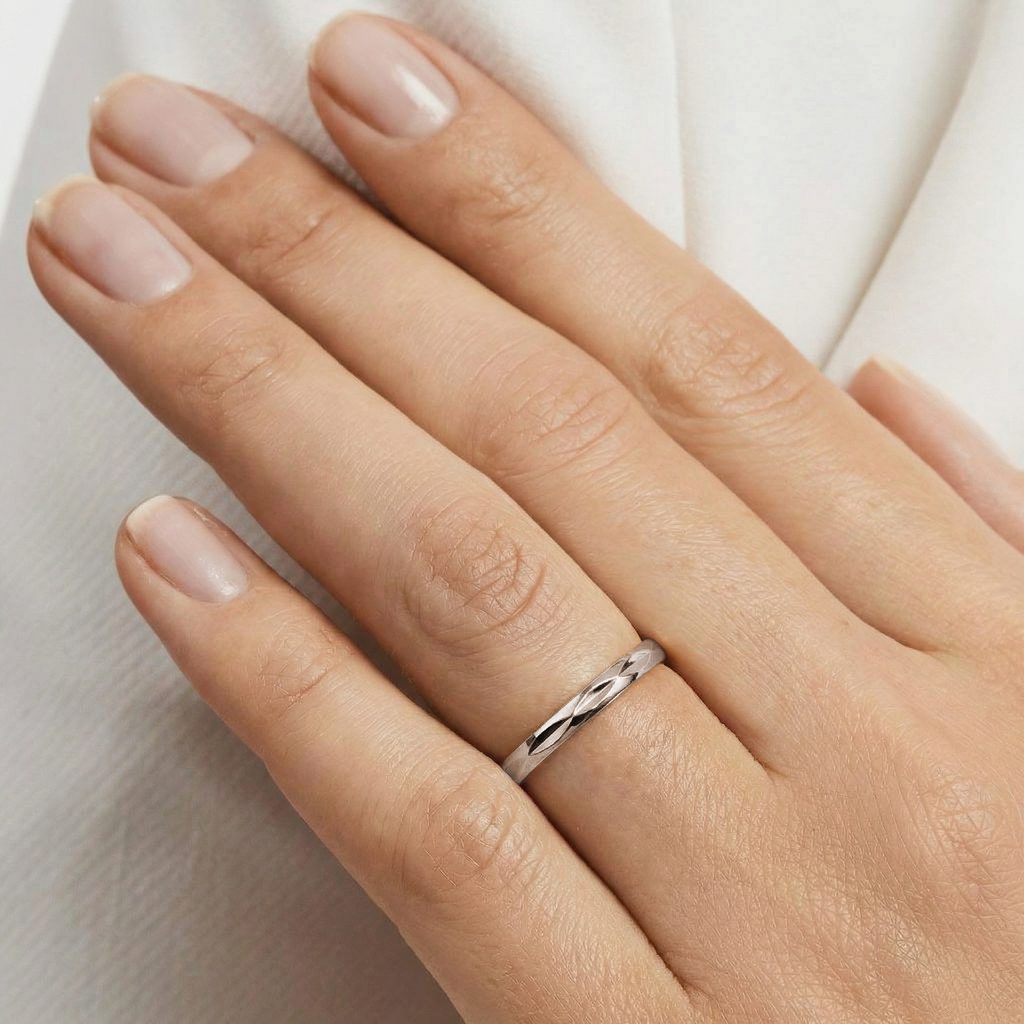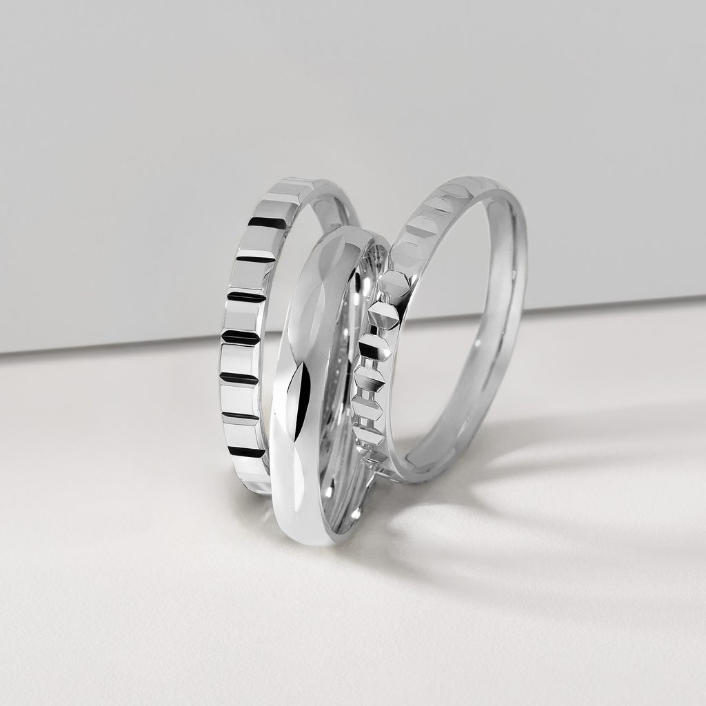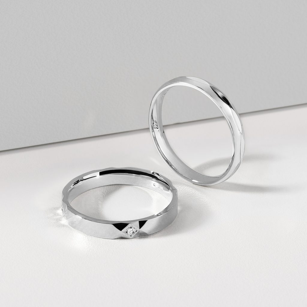 Sada snubných prsteňov z bieleho 14-karátového zlata zaujme nenápadnou rytinou, ktorá vytvára jemnú štruktúru na inak hladkom povrchu. Pôsobia čisto, moderne a pritom si zachovávajú klasický charakter. Dámsky prsteň má šírku 3 mm, pánsky prsteň 3,5 mm. Oba modely vychádzajú z rovnakého dizajnu a tvoria harmonický pár. Ideálna voľba pre páry, ktoré hľadajú jednoduché prstene s originálnym detailom.