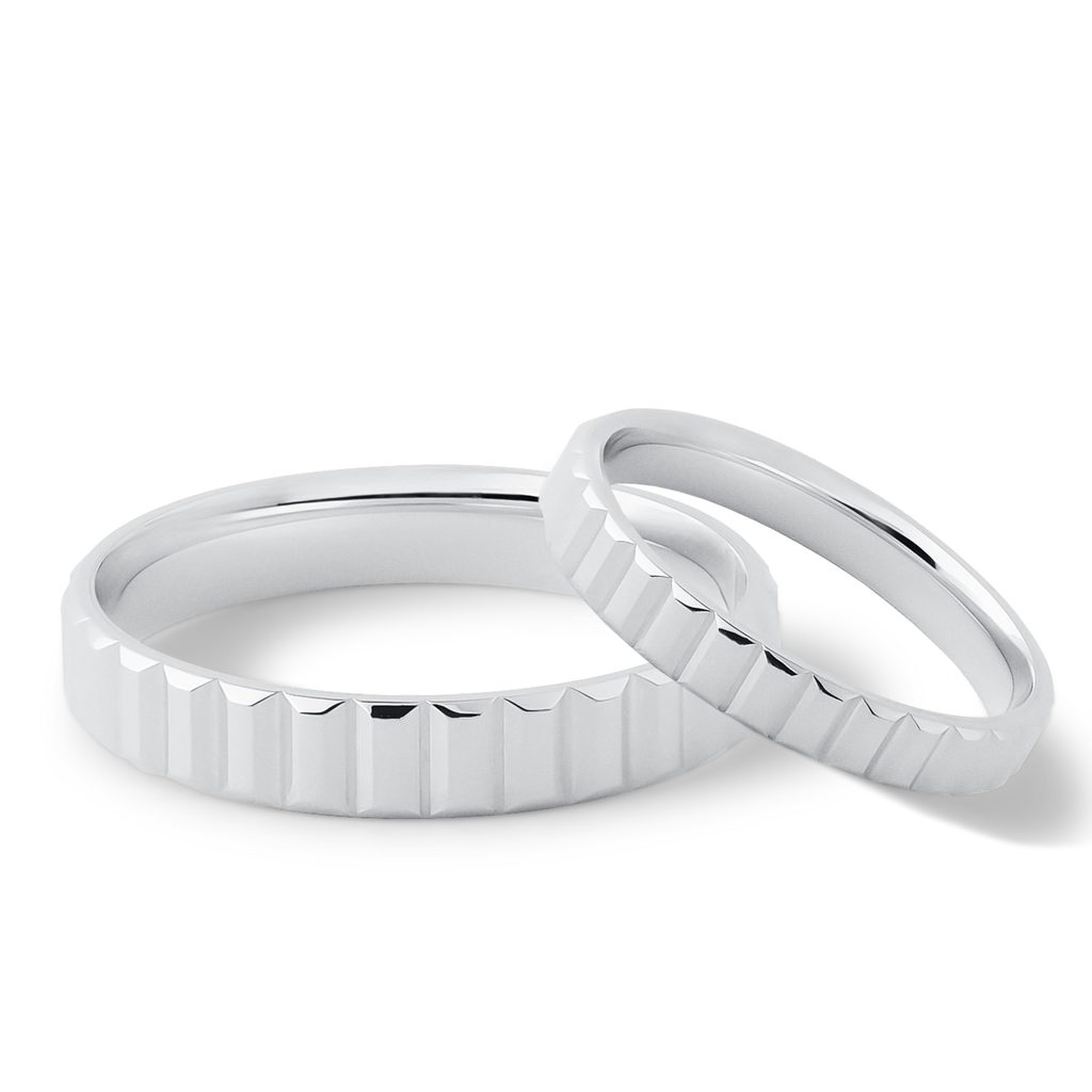 Snubný set z bieleho 14-karátového zlata upúta pozornosť profilovaným povrchom, ktorý krásne odráža svetlo a dodáva prsteňom výrazný lesk. Dámsky prsteň má šírku 3 mm a pôsobí jemne, zároveň sa ľahko kombinuje s ďalšími prsteňmi, vrátane modelov v štýle eternity. Pánsky prsteň so šírkou 4 mm v rovnakom štýle prirodzene dopĺňa dámsky prsteň. Moderná voľba pre páry, ktoré hľadajú prstene s originálnym povrchom.