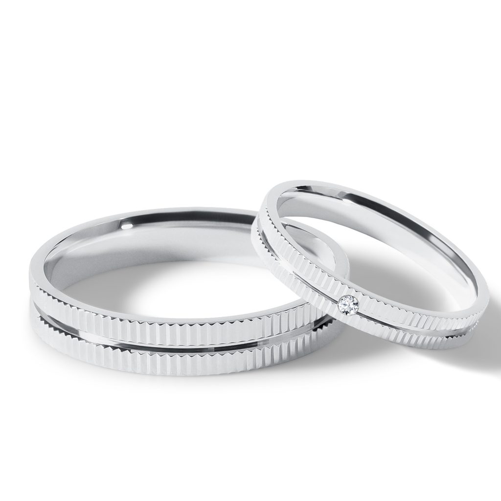 Svadobná súprava prsteňov z bieleho 14-karátového zlata s jemným vzorovaním. Dámsky prsteň so šírkou 3 mm zdobí číry diamant a pravidelné gravírovanie, ktoré pri pohybe ruky prirodzene odráža svetlo. Pánsky prsteň so šírkou 4 mm má povrchovú úpravu v rovnakom štýle. Krásna kombinácia pre páry, ktoré hľadajú svadobné obrúčky s jemným vzorom namiesto klasických hladkých prsteňov.