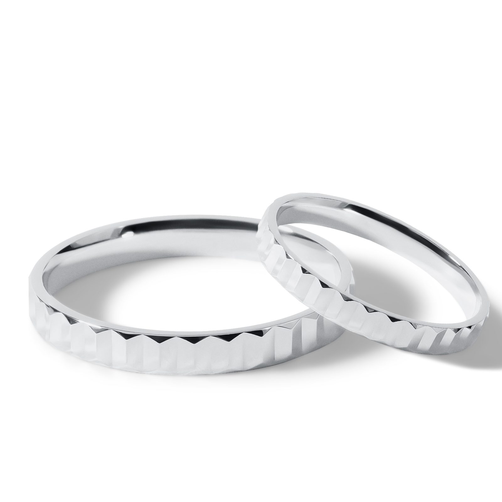 Súprava svadobných obrúčok z bieleho 14-karátového zlata s jemným plisé vzorom vytvoreným precíznym strojovým gravírovaním. Dámsky prsteň o šírke 2,5 mm pôsobí jemne a elegantne a ľahko sa kombinuje s hladkými aj diamantovými prsteňmi. V rovnakom štýle ho dopĺňa pánsky prsteň so šírkou 3 mm, ktorý ocenia muži, ktorí hľadajú klasiku s jemným, ale originálnym detailom.